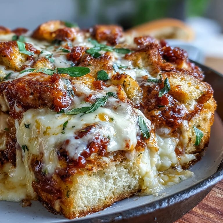 Pin It My cast-iron skillet has seen a lot of dinners, but the night I made this cheesy garlic bread lasagna was different—my daughter came home from college unexpectedly, and I had exactly forty minutes to pull together something that felt special. I grabbed a baguette from the counter, some marinara from the pantry, and suddenly this dish came together in my mind: all the comfort of lasagna but with those crispy, buttery bread cubes instead of noodles. The kitchen smelled like garlic and melting cheese before she even took off her coat.