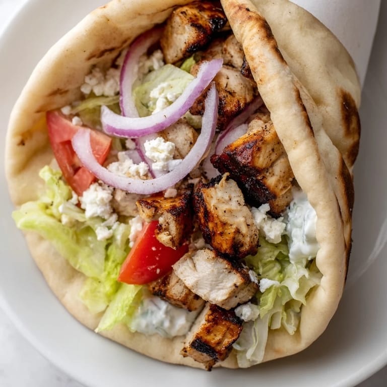 - Spread a generous spoonful of tzatziki on the inside of each warm pita, then layer in lettuce, tomato slices, red onion, grilled chicken right off the skewer, and crumbled feta if you're using it. Roll it tight enough to hold together but loose enough that you can actually bite it.