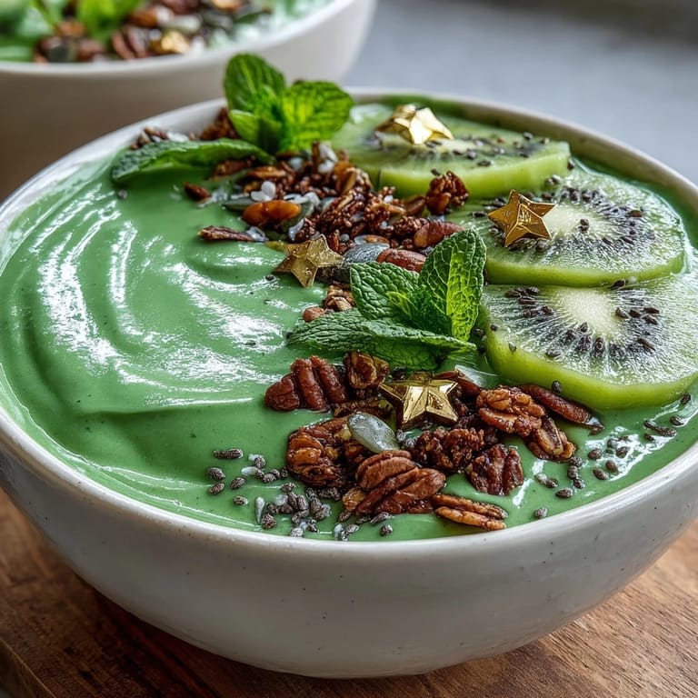 - Tuck a few fresh mint leaves into the arrangement and scatter edible gold stars or sprinkles if you're using them—these details take it from breakfast to celebration. Serve right away with a spoon because the longer it sits, the more the toppings soften into the smoothie.