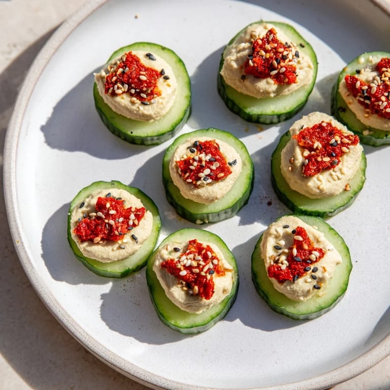 Pin It This appetizer shines with its simplicity and fresh ingredients. The crispness of the cucumber rounds contrasts beautifully with the smooth texture of hummus, making each bite both refreshing and flavorful. Ideal for serving at parties or enjoying as a wholesome snack anytime.