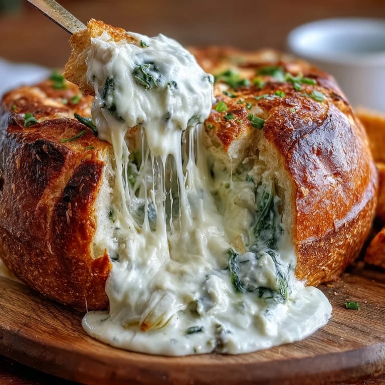 The bread bowl isn't just decoration—it's structural and it's delicious. When you hollow out that sourdough, you're left with a crust that's thick enough to hold molten dip without collapsing, but thin enough that it stays tender inside. Some people get nervous about the hollowing part, but honestly, use your fingers and a sturdy spoon and just scoop. If you accidentally create a small hole in the bottom, don't panic because the filling will seal it up as it heats. The bread chunks you tear from the center are your golden tickets—they've got the perfect surface area for scooping and the toasted edges that only happen when they've been sitting near hot dip.