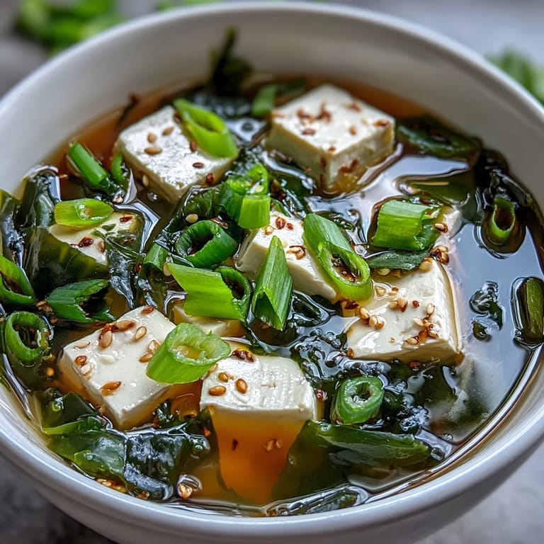 Pin It There's something almost meditative about watching wakame unfurl in cold water—those dark ribbons suddenly coming alive after being dried for months. I discovered this soup during a quiet morning in my kitchen when I wanted something that felt both nourishing and effortless, the kind of dish that doesn't demand much from you but gives back everything. The dashi broth simmers so gently that you can hear it breathing, and within minutes you're holding a bowl of something that tastes like it took hours to prepare.
